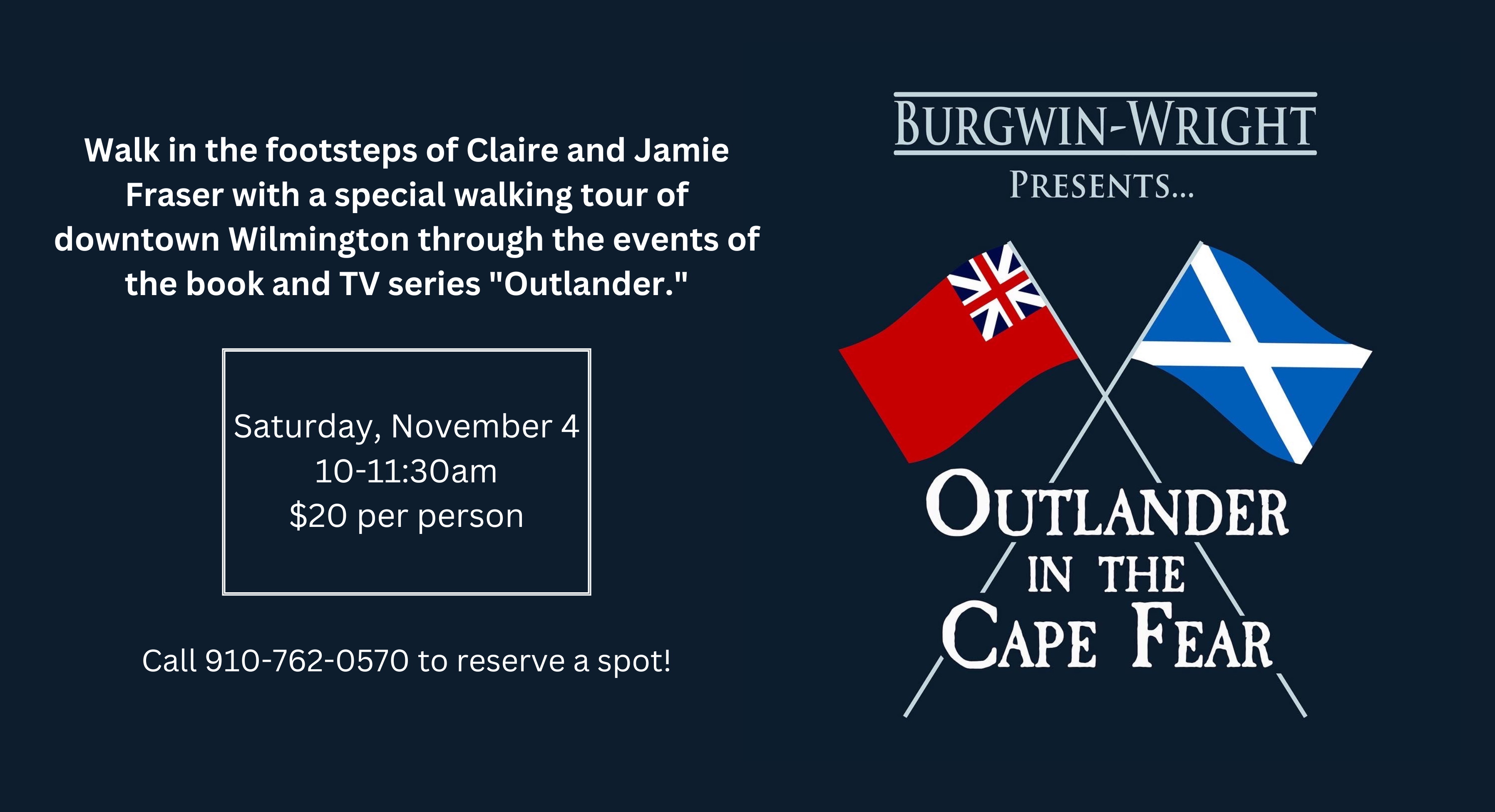Welcome To Your Home For EVERYTHING "Outlander" In The Cape Fear And Wilmington! The Burgwin-Wright House is the oldest and largest historic site open to the public today in Wilmington, making it the perfect place to learn all about the Colonial North Carolina history that is so important to the "Outlander" book and TV series. Whether it is through our podcast, house tours, waking tours or river cruises, there are so many ways to walk in the footsteps of Claire and Jamie Fraser in Wilmington. Scroll down to learn about all the "Outlander" we offer! The best place to start is with our podcast, "Burgwin-Wright Presents... Outlander In The Cape Fear." Each episode of the podcast takes an event, character or theme from the "Outlander" series and talks about the fact behind the fiction. Listen for free on all podcast platforms including Spotify, Apple Podcasts, Google Podcasts, Stitcher, iHeartRadio, TuneIn or in the player below. "Outlander in the Cape Fear" River Cruise