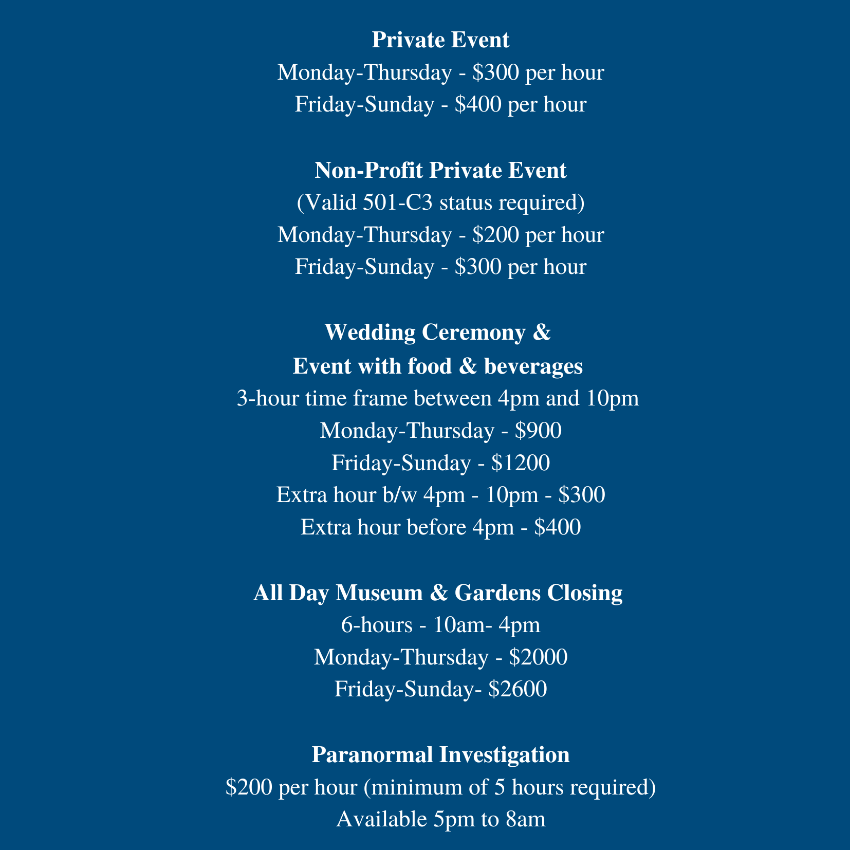 Private EventsFor your historic occasions, a peerless venueSituated in the heart of downtown Wilmington, Burgwin-Wright House and Gardens offers an unparalleled greenspace and historic site for any event you are hosting. For more information about our packages and to schedule a walk-through of our venue, please e-mail [email protected] or call 910-762-0570. _____________________________________________________________________________________________________ Rental includes:- Access to the acre of Colonial Revival gardens, and Courtyard - Access to the porches from the exterior stairs only. - Access to catering kitchen, restrooms, and Kidder Art Gallery - Access to the staff parking lot - Renters have the option of using their own vendors - Option to rent tables and chairs from the museum (limited qty.) - Option to rent a projector, screen, American flag, and television (interior use only) _____________________________________________________________________________________________________ Please Note:- The Burgwin-Wright House & Gardens has an occupancy limit of 100 people outside/50 people inside. - All event rentals require a $500 refundable damage security deposit. - A state sales tax of 7% will be applied to all rental fees. - A credit card service fee of 3% will be applied to all transactions. - Only beer and wine are allowed with additional $250 damage deposit.